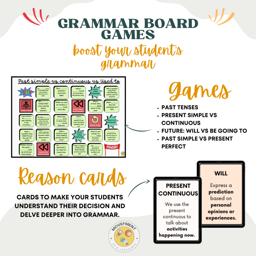 - Four grammar boards to review verb tenses (past tenses, present simple vs present continuous, will vs be going to and past simple vs present perfect)